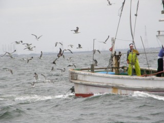 【左】佐久島に向けてヨットが出航 【右】漁船に集まったウミネコやカモメの仲間