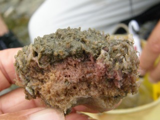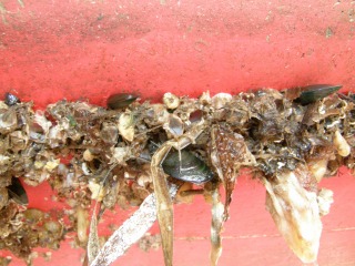 【右】漁船の底に付いた海の生き物、中心はミドリイガイ