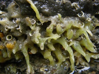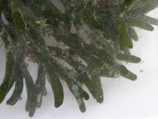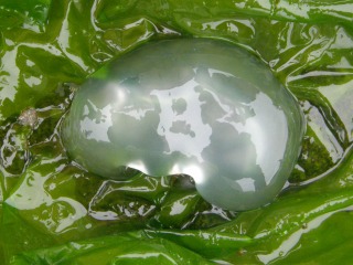 【左】アナアオサの上はミズクラゲ