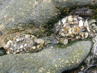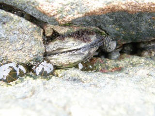 【左】岩の割れ目にカニさんが隠れている。 【右】オオヘビガイ