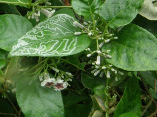 【左】ハマサオトメカヅラ。ヘクソカズラの海岸生のものです。字書き虫、いわゆるハモグリバエやハモグリガなどの幼虫が葉の中に潜り込み、葉の内部を食べ進んだ跡が空洞になった白い線に見える。