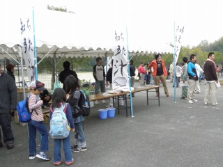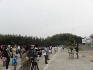 【左】受付風景 【右】開会式、この時にカワウの大きな群れが移動しました。