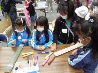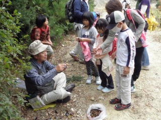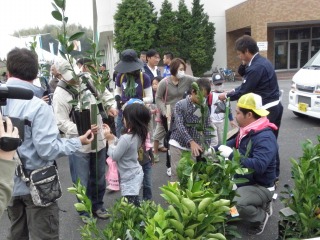 身近にあるオレンジラインに名にふさわしくミカンを植えることにしました。記念樹として家族で一本ずつミカンの苗木をいただき、自然観察ハイキングをしながらオレンジラインに向かいました。途中、オレンジラインの自然について説明を聞きながら植樹予定地に向かいました。現地で植樹し、思い出となるよう竹で作った名札に家族の名前を書いて立てました。