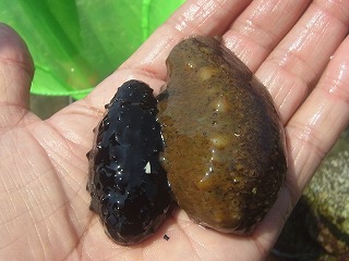 【左】マナマコの色違い           【中】サンショウウニ           【右】バフンウニ
