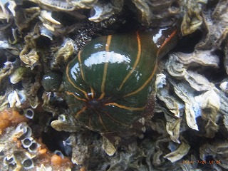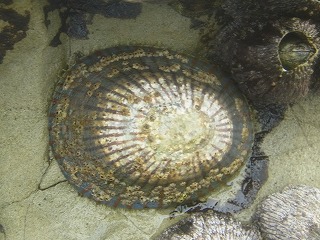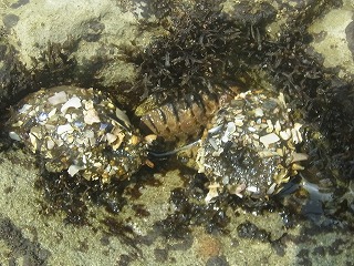 【左】スガイ       【中】ヒザラガイ       【右】コシダカガンガラに外来のシマメノウフネガイが着生しています