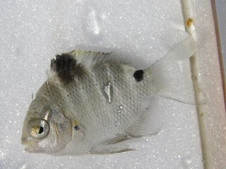 【左】暖かい海から黒潮に乗ってきたシマスズメダイ。冬は見られなくなります。