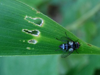 【中】笹の葉の穴は誰の仕業でしょう。虫はニクバエの仲間でしょうか。