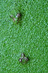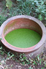 【右】常滑焼の壺桶。アオウキクサが前面に生え、中からトノサマガエルが顔を出していました。