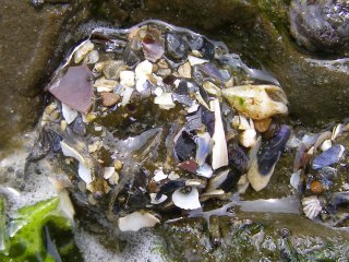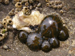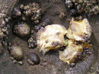 【右】タテジマイソギンチャク、カキ、フジツボの一種。