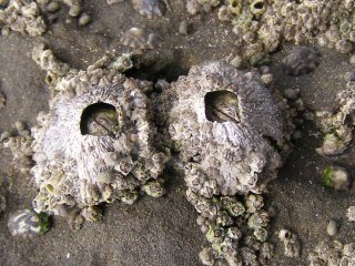 【左】大きいのがクロフジツボ、小さいのがイワフジツボ。