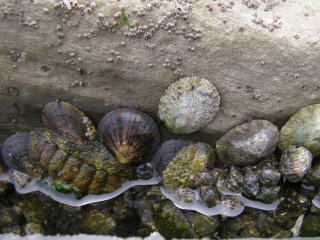 【左】ヨメガガサ、マツバガイ、ヒザラガイなどが見られる。