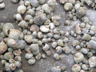 【右】飛沫帯に住むタマキビガイ