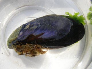 【左】ムラサキイガイ。下の茶色い髭は足糸