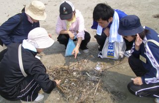 【右】漂着物の中に住むトビムシ、ハサミムシを観察。