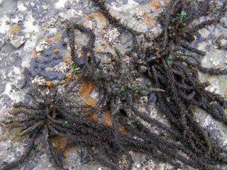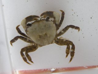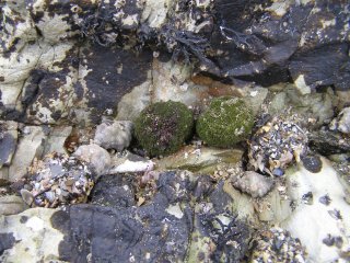 【左】石の下にカニさんがいました。 【右】岩にたくさんの生き物が付いていました。