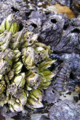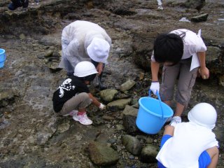 【左】グル−プごとに磯に下りました。  【右】足元に注意をしながら下りました。
