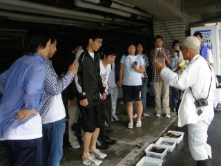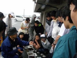 朝から雨でした。雨天の磯での生き物観察は怪我つき物です。時々大怪我をする場合がありますので中止にすることがほとんどです。最初に磯での怪我について予告しておいた効果でしょうか一人もけが人が出ませんでした。雨の中、高校生たちは、雨具を付けずにずぶぬれになり活躍しました。  雨のためか採集した生き物の種類は昨年に比べて少なかったですが昨年見られなかった生き物も観察することが出来ました。採集した生き物のまとめは雨天のため旅館の駐車場を借りて行いました。(記・降幡)