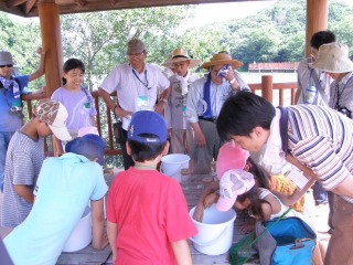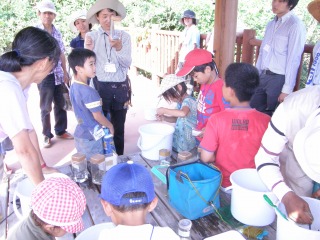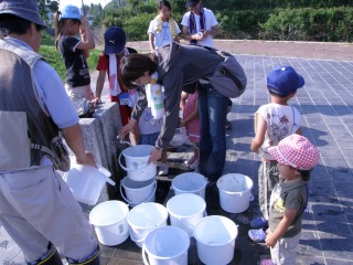 【右】使ったタモやバケツを洗うのを子供たちも手伝ってくれました。