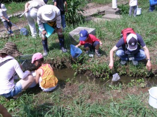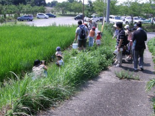 今回の観察会は、ため池、水路、水田にどんな生き物が生活しているか。生き物がどんなかかわりを持って生活しているか。私たち人間とのかかわりはどうかなどを皆さんと考えていただくために行いました。現地で生き物を採集し、直接触れながら実体験をする方法で実施されました。(記・降幡)