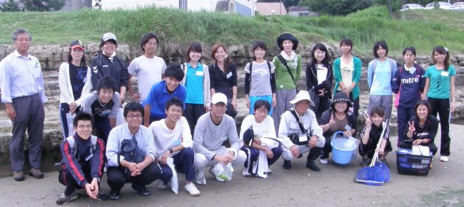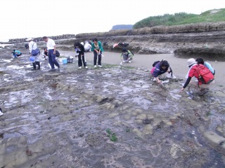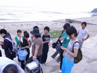今年は梅雨明けが遅く、曇天中出発しました。(こんなに涼しいことも珍しい!)若い初々しい先生方は山のほうから見えた先生、海に近い地元の先生、町からの先生、多様な皆さんが明るく元気に参加しました。研修項目を選択でメニューを決めた関係からか、若い先生は、熱心に海辺の生き物観察とネイチャーゲームに熱心に取り組みました。一番人気だったのは、図鑑の中でしか見たことのないものを実際に見ること。そして、イソギンチャクに指を入れて吸い付く感じを確かめること。指がしびれたりしないのかとだれでも思いますよね。ウニを見るのも初めてなのに、ウニを手の上に乗せそれがゆっくり動く姿を目にすること。アナアオサを実際に食べてみること。磯のにおいをかいだり海の塩辛さを体験すること。知っているようでやったことのないこと・・・に五感を働かせて、みなさん楽しく取り組んでいました。・・・・と、あれよあれよという間に潮が迫ってきました。後半は、自然の中に隠されている人工物を探す「カモフラージュ」の体験。これをすると観察する目が養われ、見えないものが見えてきます。2回目探すときには半分以上探せる方がほとんどでした。今年度は7月に合計4回8月に2回の自然体験研修が行われます。(記・竹内秀)
