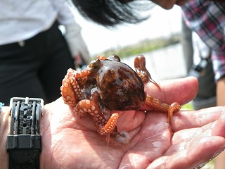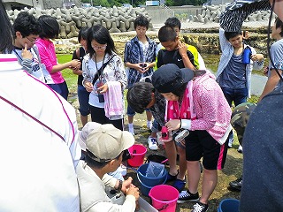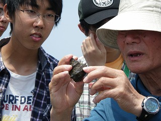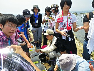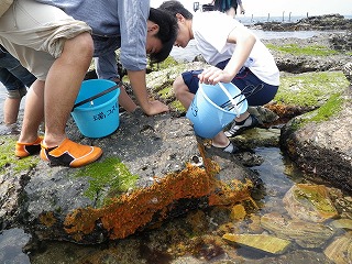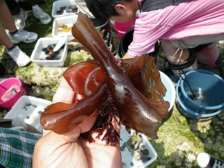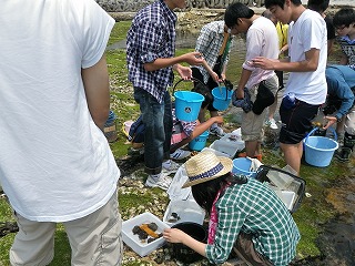 講師陣は生徒達に磯の環境と生きものを現地・現物で体感し、「きもい !」という感じを少しでも払拭してもらう様に努めました。多くの生徒達はヌルヌルとしたアメフラシやナマコを手づかみしたり、イソギンチャクを突っついたりとすぐに慣れてくれました。また、何人かが採集中に足を滑らせたり、転びかけたり、深みにはまったりして、磯の危険も体験してくれました。