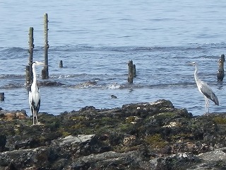 昨年に引き続き、コスモサイエンスコース1年40名を対象にした磯の生きもの観察会を実施しました。スタッフはやや早めに現地到着し、人気の少ない間に下見を兼ねて周囲を一巡しました。早出の甲斐あってかトビ10羽、アオサギ4羽、(ハシボソ)カラス2羽を間近で撮影することができました。