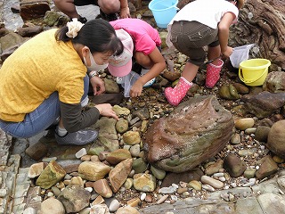 【左】生き物の採り方を説明 【中】大物を狙っています。 【右】カニさんが石の下にいました。