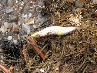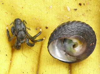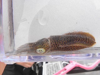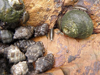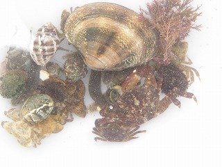 【左】アオリイカの子ども 【中】イボニシ(左)とスガイ中間にフナムシ 【右】カリガネイガイ