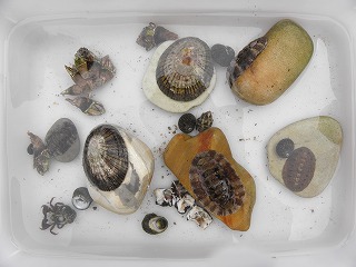 【左】ケハダヒザラガイ? 【中】参加者が採集した生き物。マツバガイ、イボニシ、スガイ、ヒザラガイヤドカリなど 【右】参加者が採集した生き物