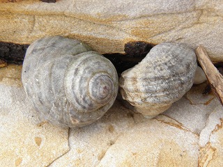 【左】ウミウシの仲間の卵塊 【中】イシダタミ 【右】タマキビガイ