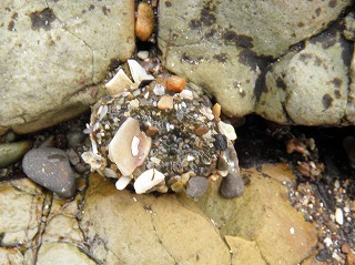 【左】貝の仲間があけた穴 【中】カニに寄生したフクロムシの仲間 【右】エゾカサネカンザシ(管状)とダイダイソカイメン