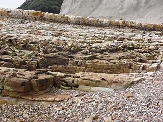 【左】南知多の地層 【右】「えぎ」(餌木)といいアオリイカを釣るための疑似餌と縦網(漁具)