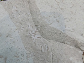 【左】ノジュウールの中にカニノツメ化石 【中】スナモグリの完全化石 【右】生き物の移動した跡の化石