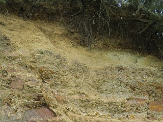 【左】断層の跡 【中】最上部の段丘堆積層。チャート礫も見られる 【右】海岸散歩。緑色はアナアオサという海藻