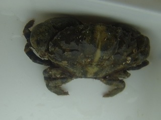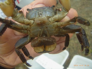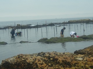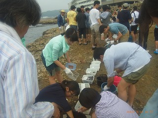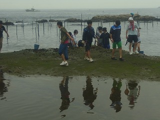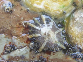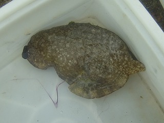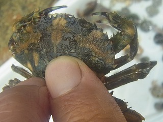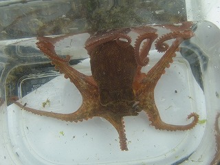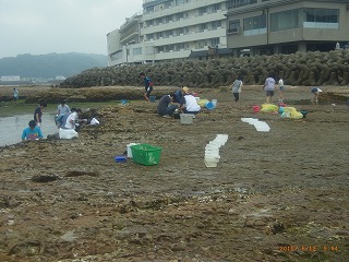 雨が心配されていたが観察中は降らなかった。磯が濡れていたので転倒の注意をしたが2名転んで擦り傷を負った。干潮時間が早かったので採集した生き物の種類は少なかった。(記・降幡 )