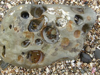 【左】マガキ 【中】穿孔貝が開けた穴 【右】マダコ