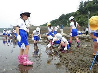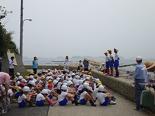 師崎小学校主催の「海に親しむ会」は、地域の海辺にすむ生き物や自然、産業について、学んだり親しんだりする活動を通して、環境問題やその保全について考え、自然豊かな郷土を愛する心豊かな児童を育てること、なかよし班での活動を通して、学年の枠を越えた人間関係を育てることを目的として、毎年、この時期にこの海岸で開催されています。