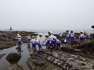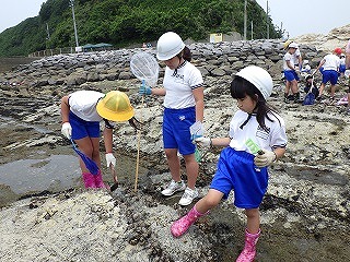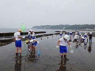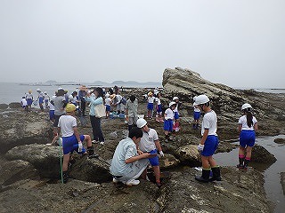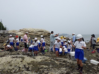 前日の天気予報ではとても暑くなるとの予報でしたが、薄曇りで海辺の観察をするにはよい天候となりました。指導員から危険な生き物の紹介ののち、班ごとに分かれて講師の示した観察拠点を中心として、なかよし班での観察が始まりました。磯は滑るから走らないように、危険な生き物がいるから素手では絶対に触らないよう注意しましたが、誰ひとりとして勝手な行動をする児童は見られませんでした。それどころか、低学年の児童がなかなか生き物を見つけられず悪戦苦闘していると、高学年のお兄さん、お姉さんが優しく手を引いて教えている姿が見られました。
