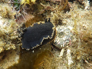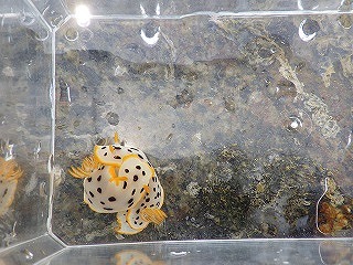 【左】班ごとの解説の様子         【中】シロウミウシ         【右】クロシタナシウミウシ(水中撮影)