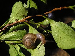 【左】知多地方でよく見られるイセノナミマイマイがヒサカキの葉にいました。