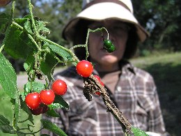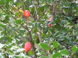 【中】カラスウリが赤い実をつけていました。「食べれますか」「食べれません」