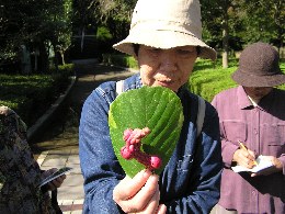 【中】葉の形に特徴があるハクモクレンです。赤いのは果実です。