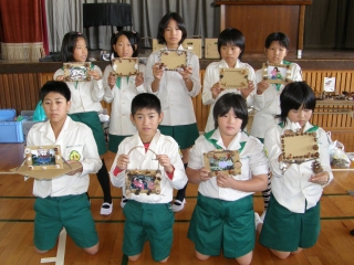 午後の工作は額作りで、“今回は写真の入れ替えが出来るようにつくろう”とみんな一生懸命でした。素敵な写真がいっぱい。出来上がった作品を手に記念撮影をした。(記・中井三)