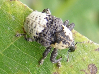 【右】クズを食べるオジロアシナガゾウムシ