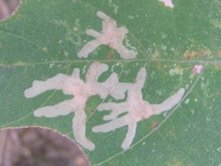 【右】ハモグリバエ。別名ジカキムシ(字書き虫)の仕業でしょうか。