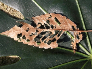 【左】虫に食べられたケヤキの葉