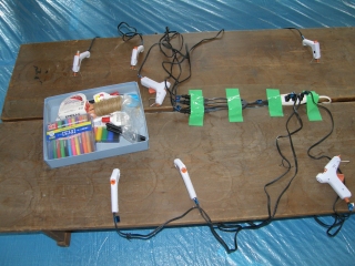【左】ホットボンドの使い方を練習しています。