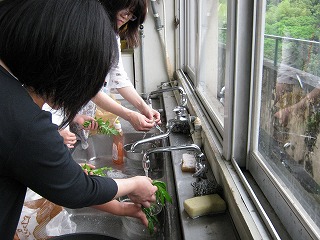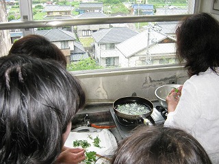 【左】お好みの野草を班ごとに受け取り 【中】テンプラの開始 【右】子供も御手伝い