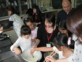 調理をする会場では、予め黒板に掲示してあった天ぷらの揚げ方について補足説明し、天ぷらを揚げ、試食をしました。