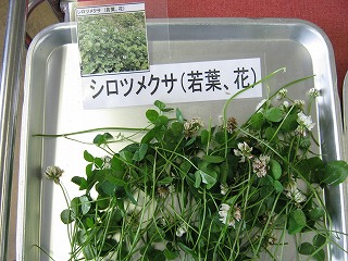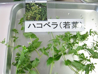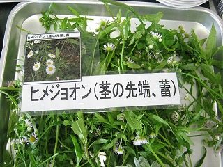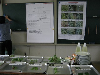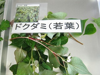 当日の開始時は小雨でしたので、雨天対応バージョンで進めました。野草の見本12種は当日9:30から9:50までに採集し、各室に用意しておいたバット(ラベル添付)に展示しました。(校庭北川の植栽周辺は雑草が刈られており、ドクダミ、ヨモギ、セイタカアワダチソウが僅かに残るのみでした。)
